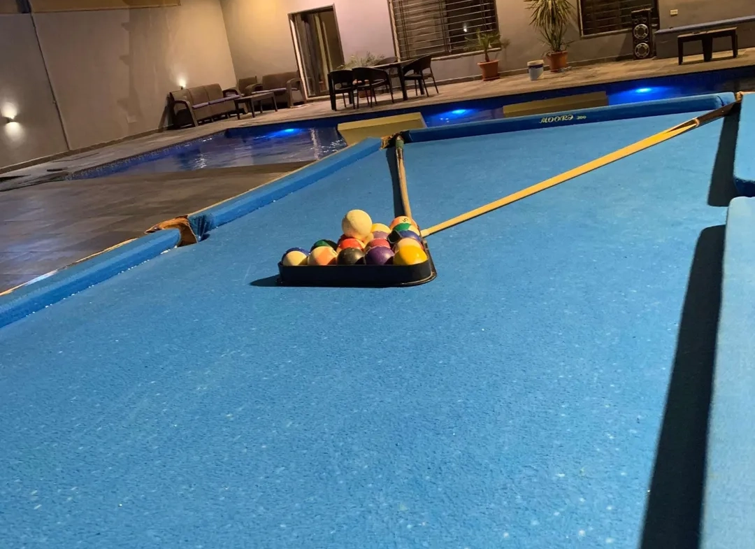 مسبح خارجي بحجم (11*5) وعمق متدرج من (90سم /لمترين) يتم تعقيمه بشكل يومي.
