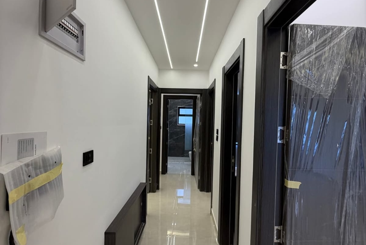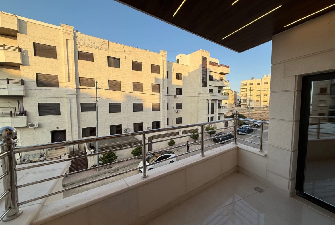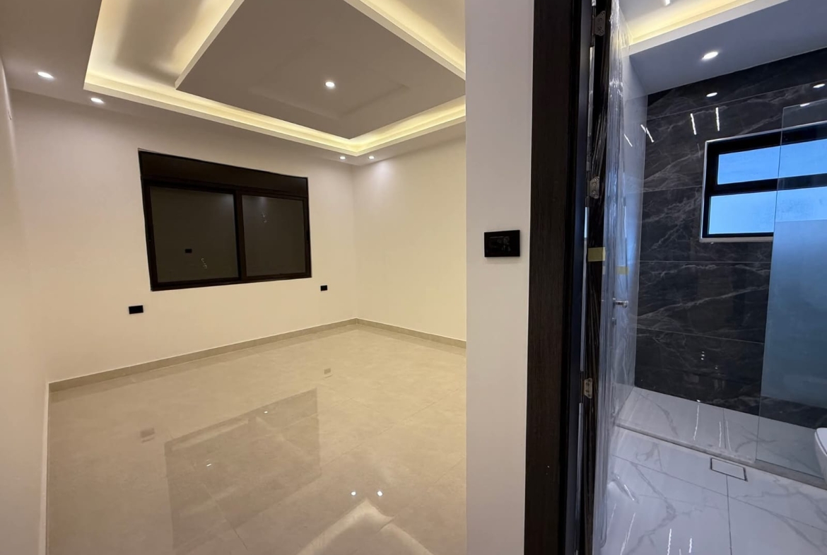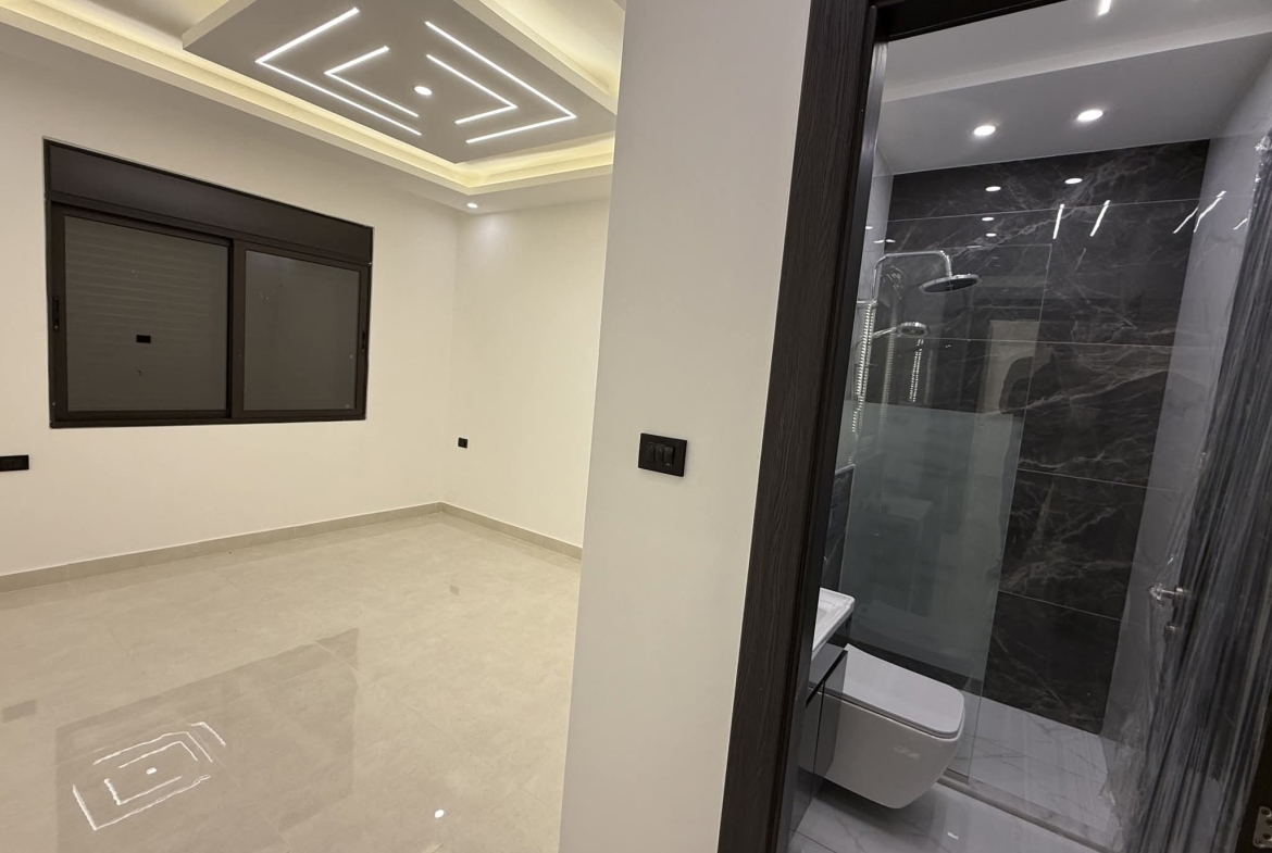 مكونة من 3 غرف نوم منهم 2 غرفة ماستر + صالون + صالة معيشه + مطبخ امريكي + حمامات عدد 4 + برنده + كراج مستقل تحت العماره.
