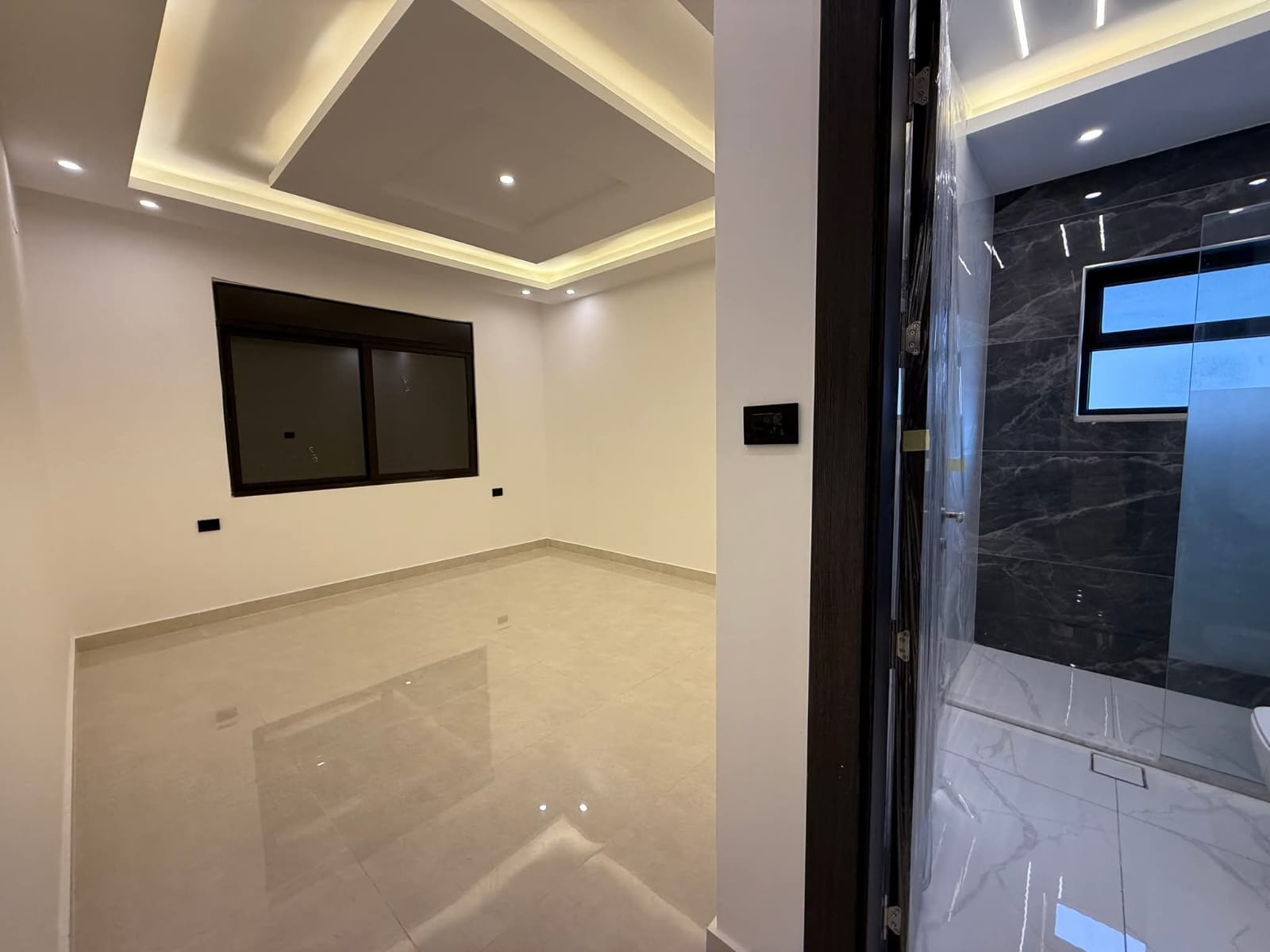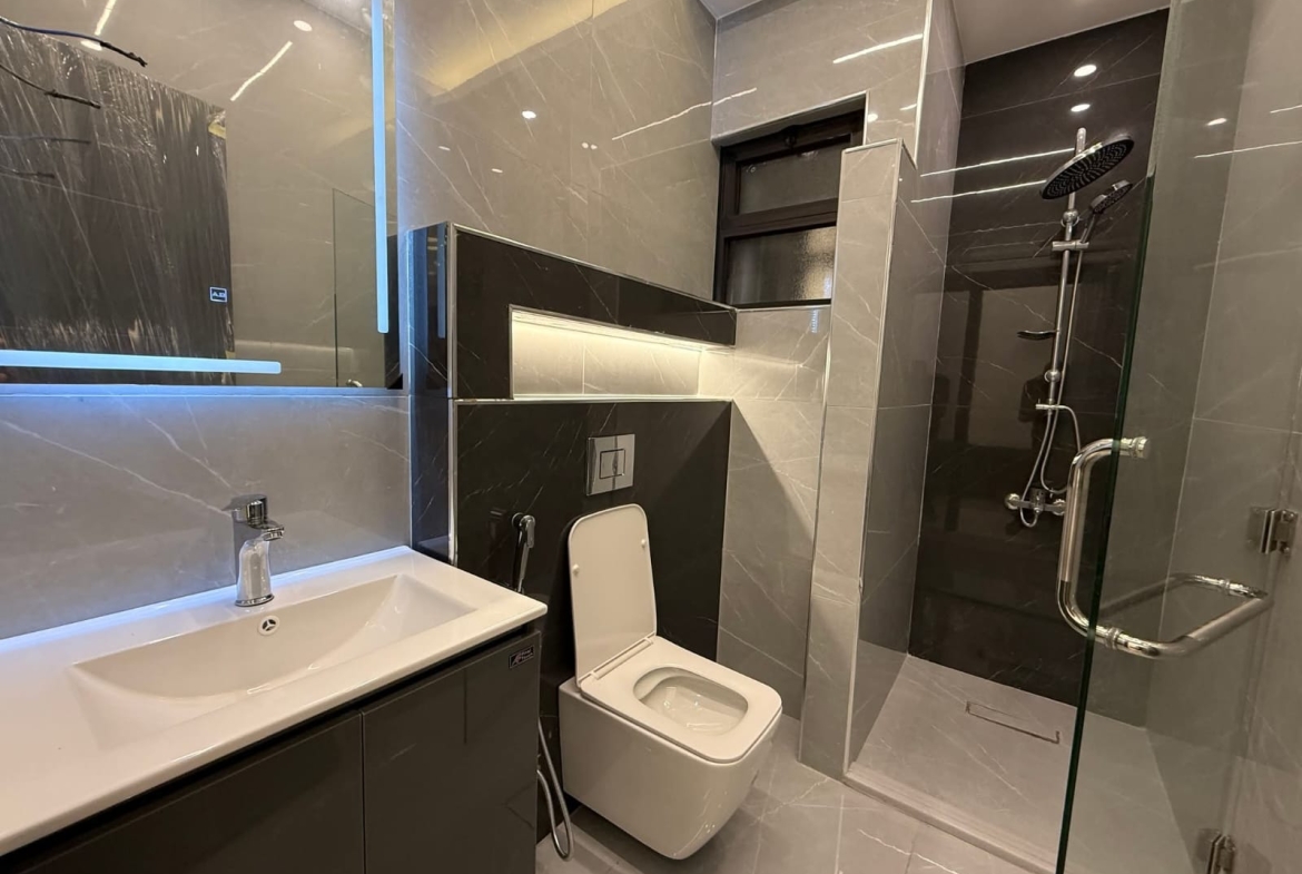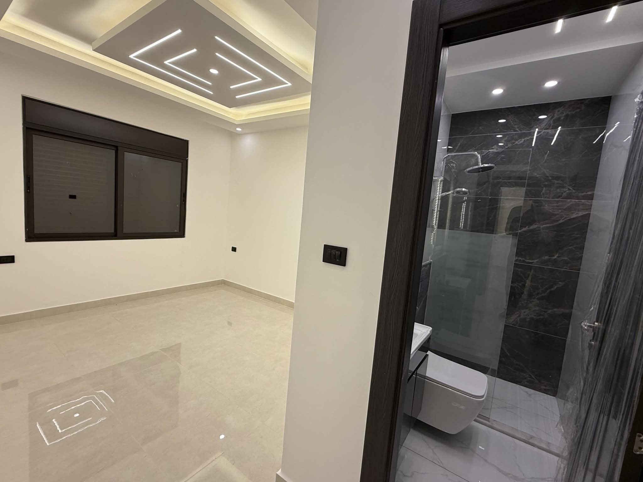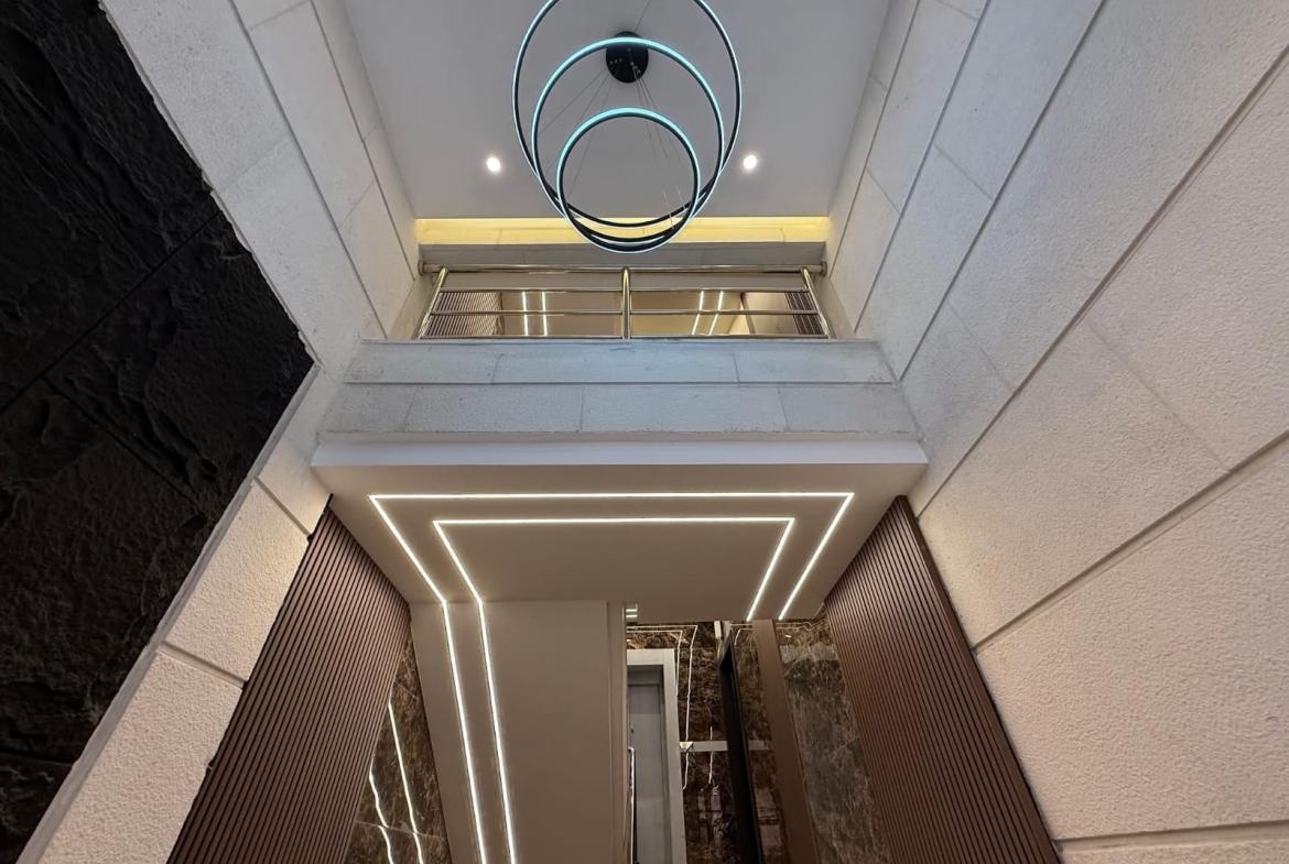 مكونة من 3 غرف نوم منهم 2 غرفة ماستر + صالون + صالة معيشه + مطبخ امريكي + حمامات عدد 4 + برنده + كراج مستقل تحت العماره.